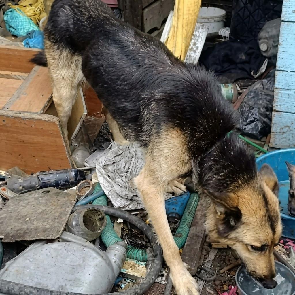 .Животное было приковано наглухо к столбу короткой, метрового размера, ржавой цепью, без доступа не только к пище, но даже к питьевой воде.Как выяснилось позже, прежние хозяева квартиры, не пожелав заботиться о питомце, попросту съехали и бросили его, оставив его умирать в полном одиночестве.